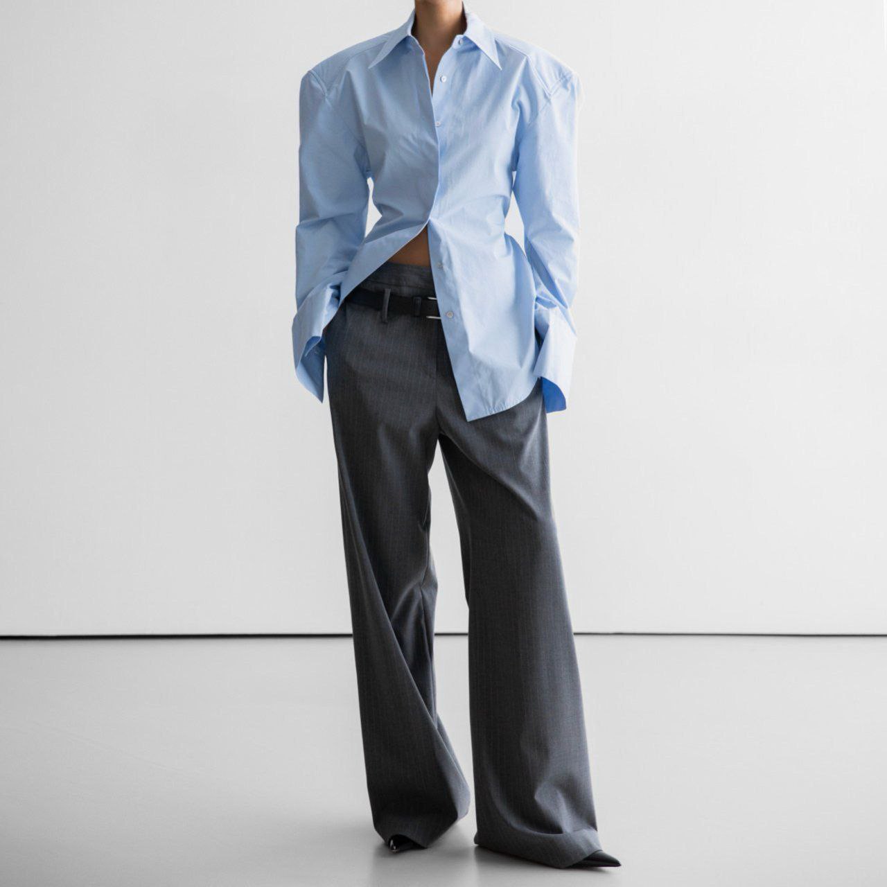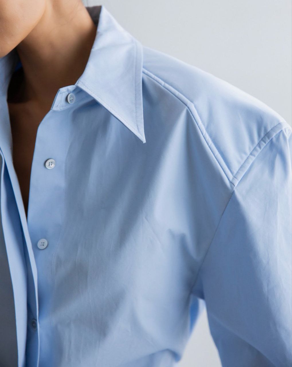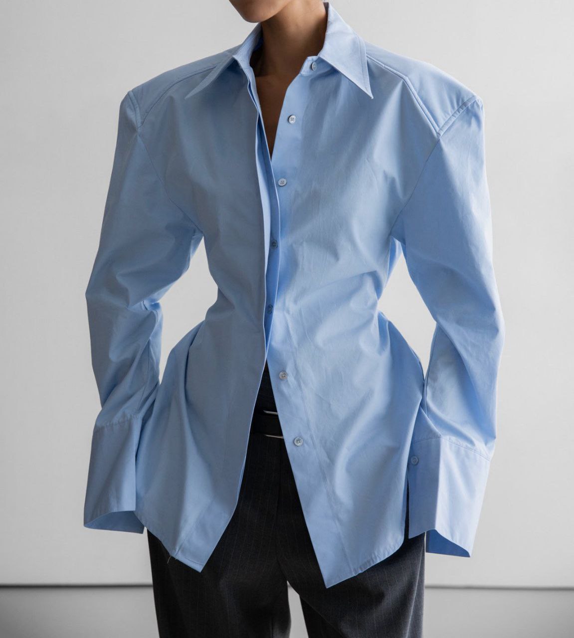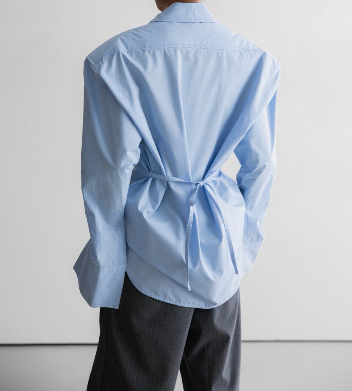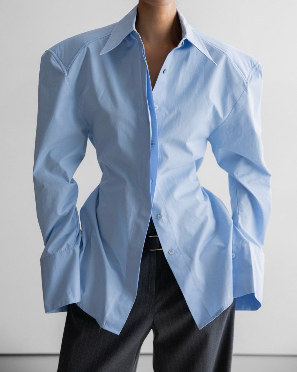 Рубашка с острыми в голубом цвете, талия регулируется завязками сзади;