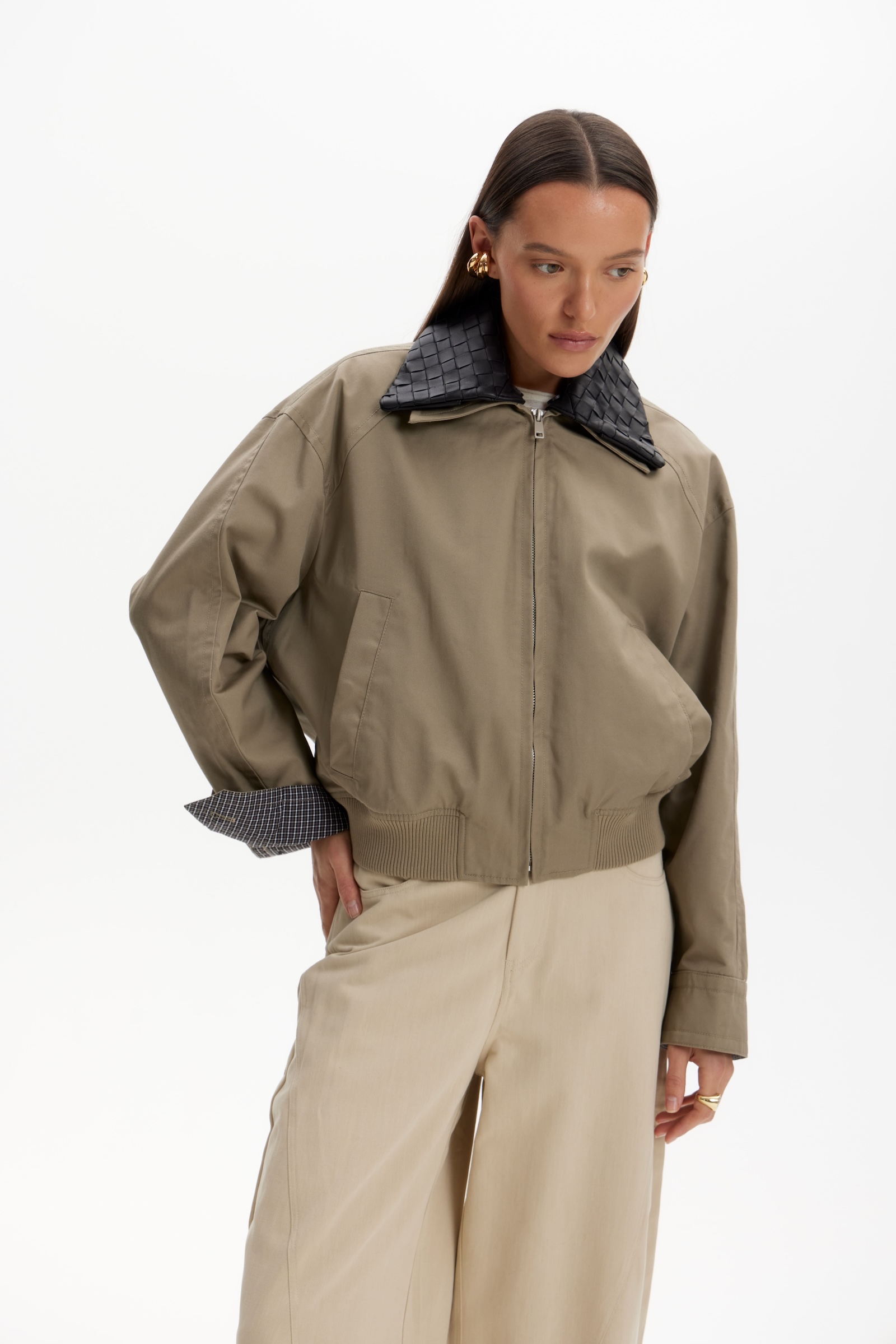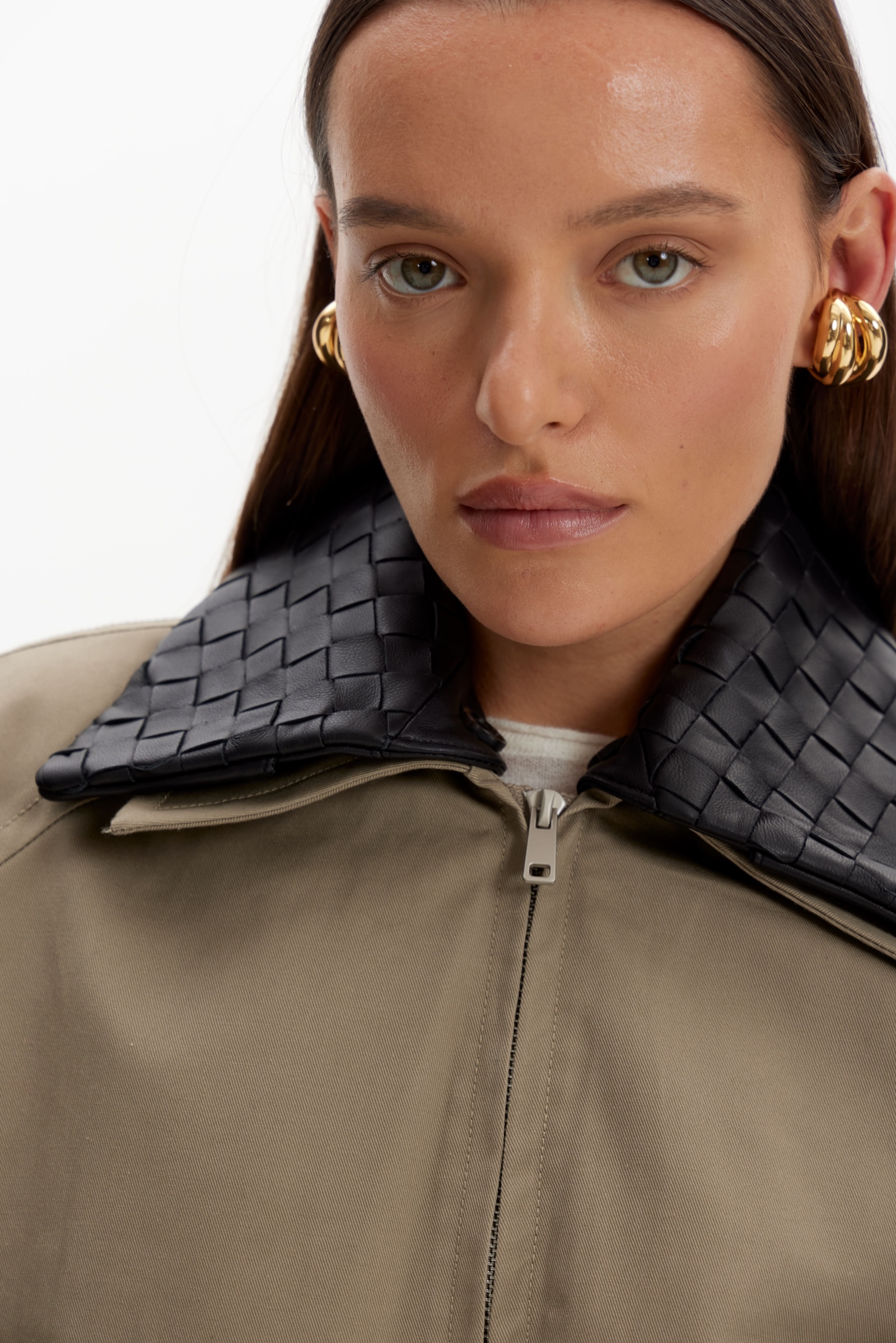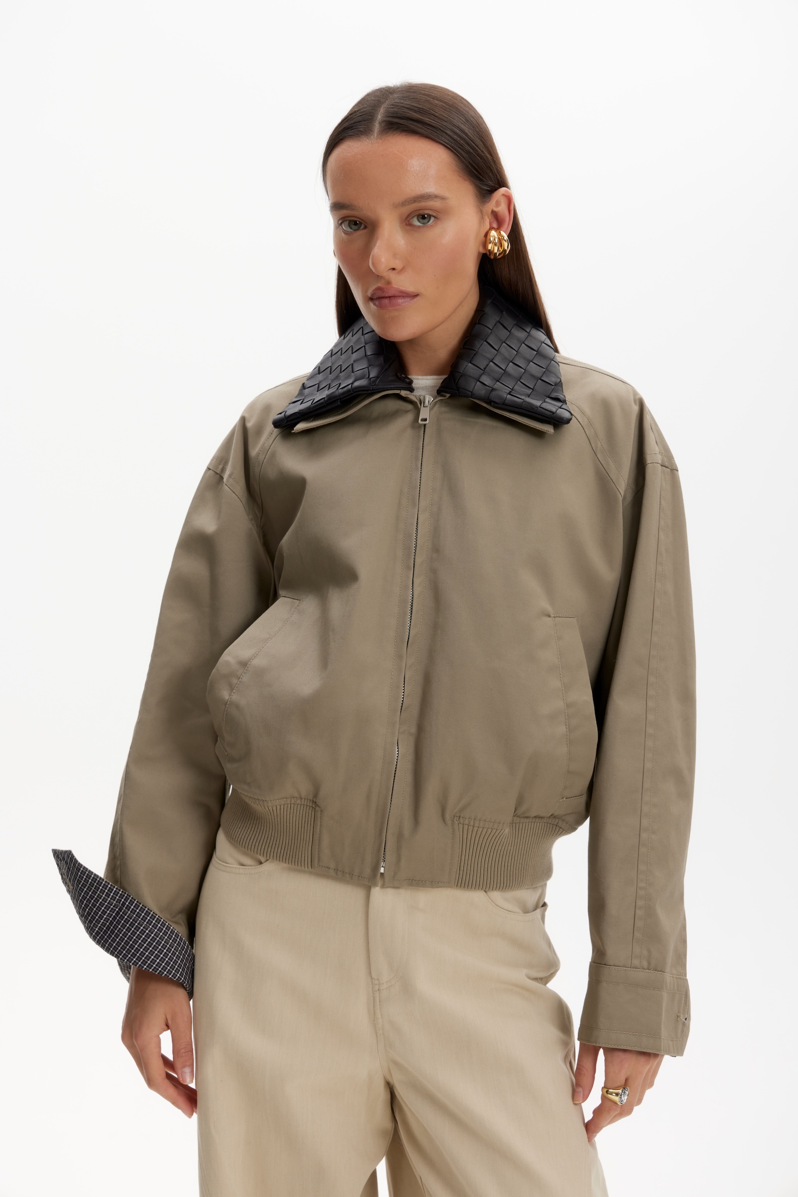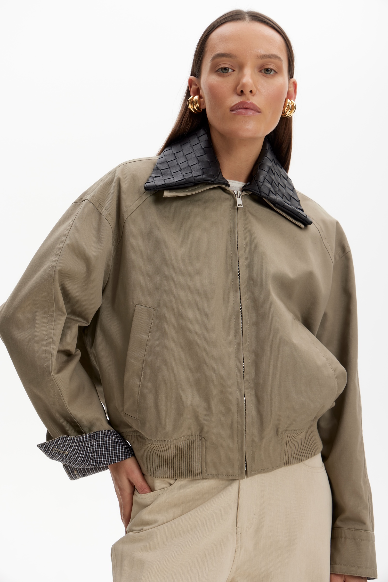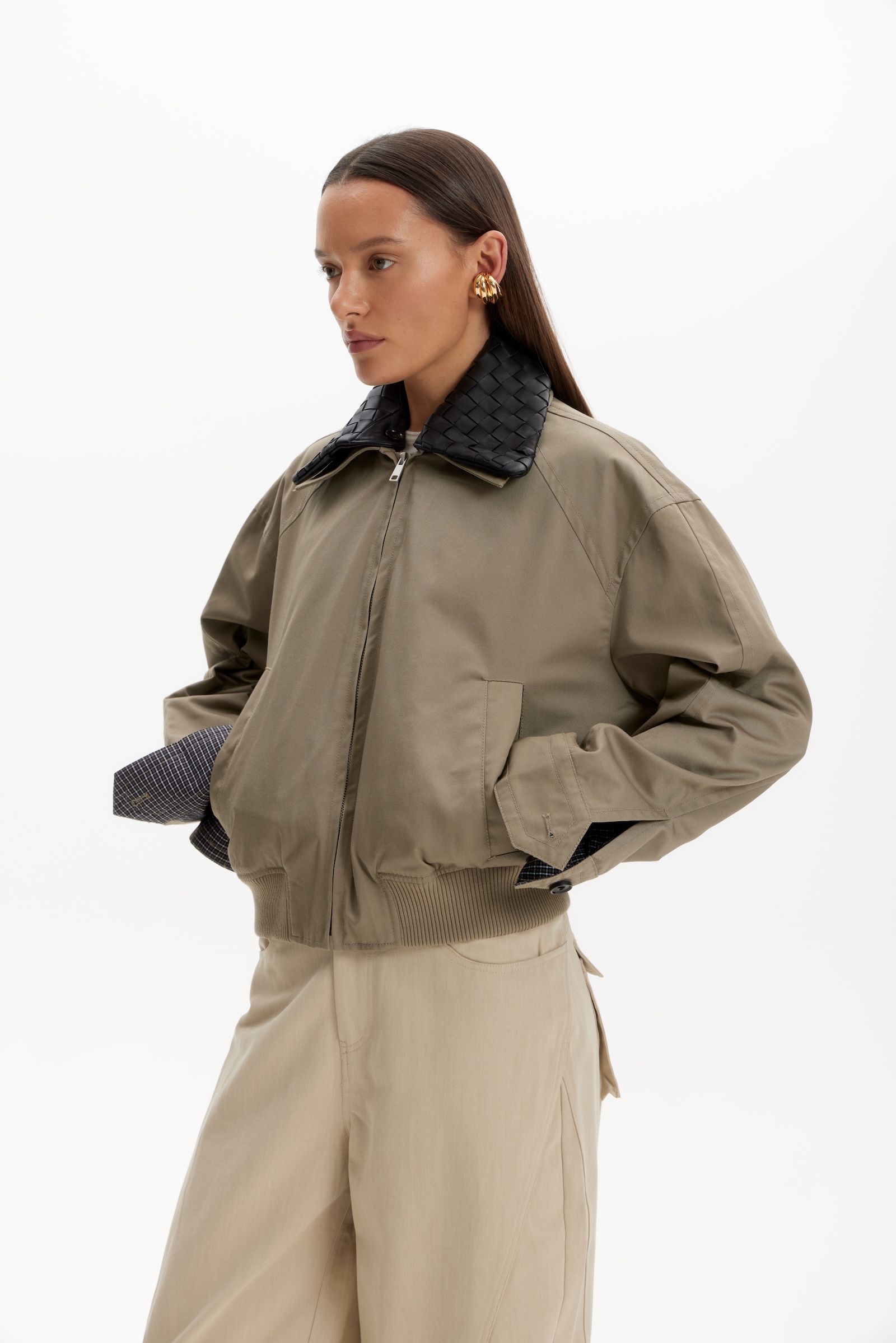 Бомбер с кожаным воротником в бежевом цвете. Съемный воротник.