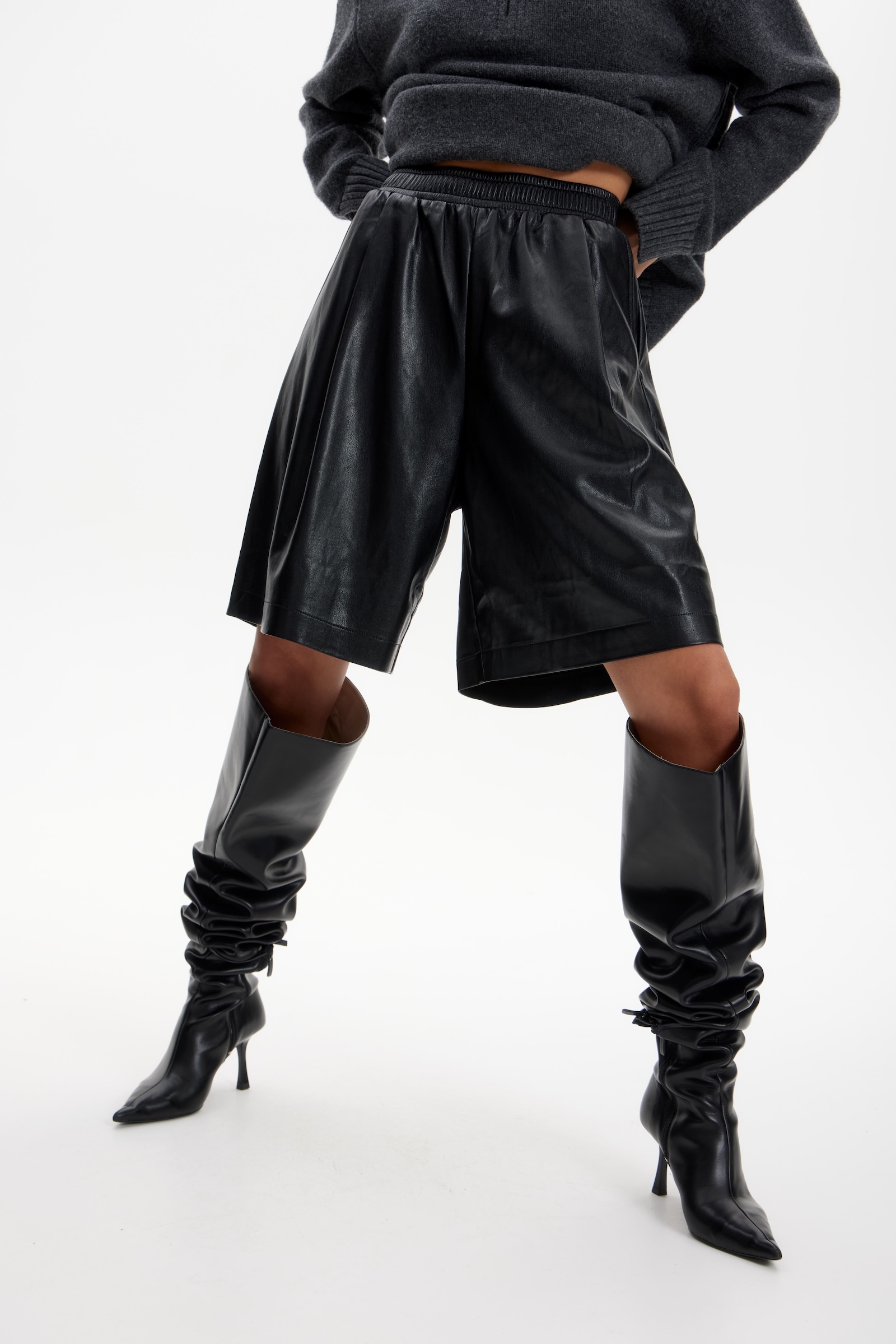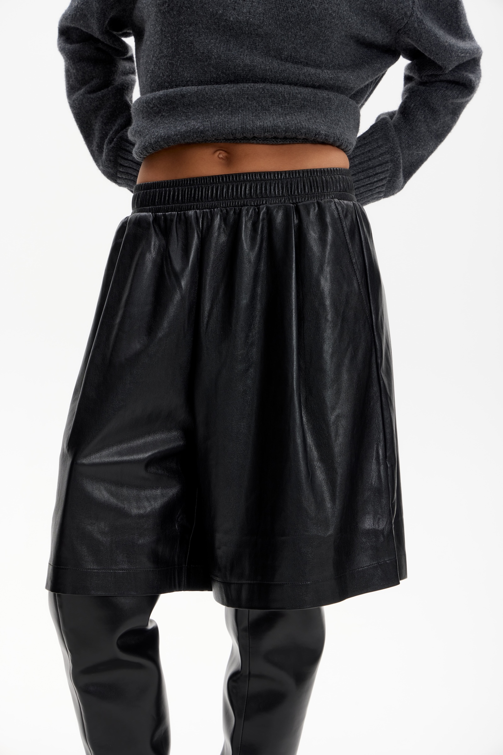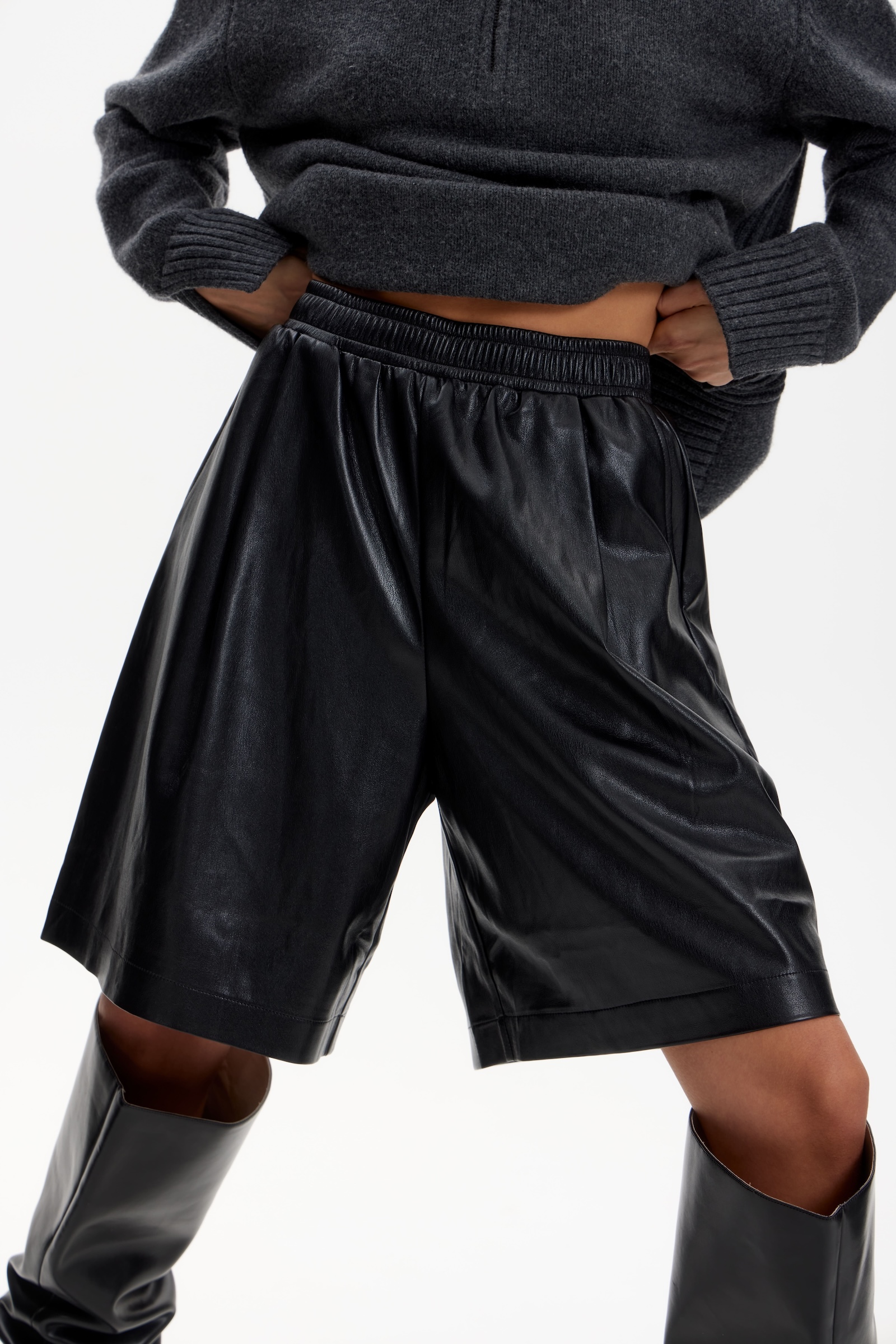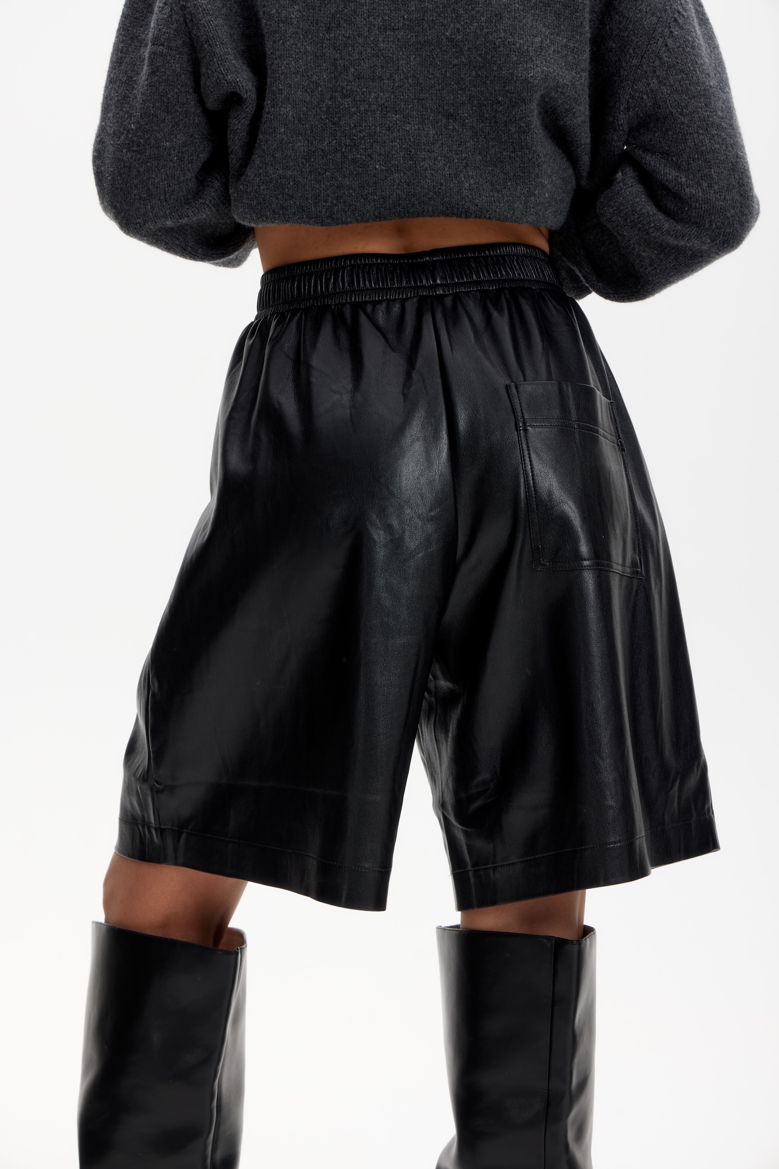 Бермуды на резинке из экокожи в черном цвете.