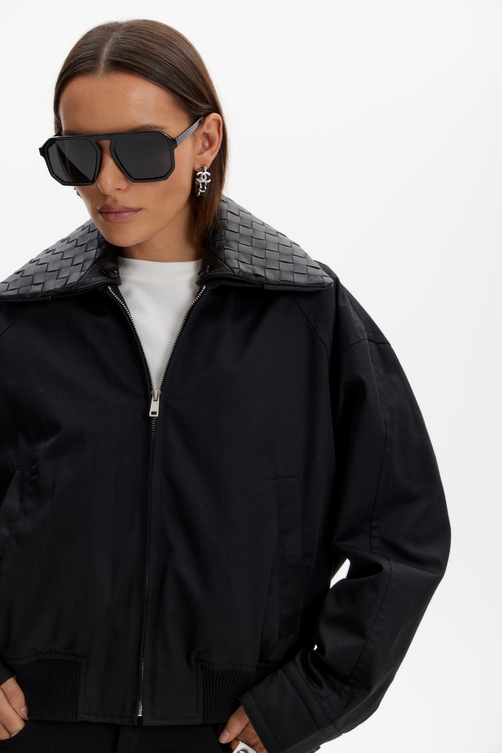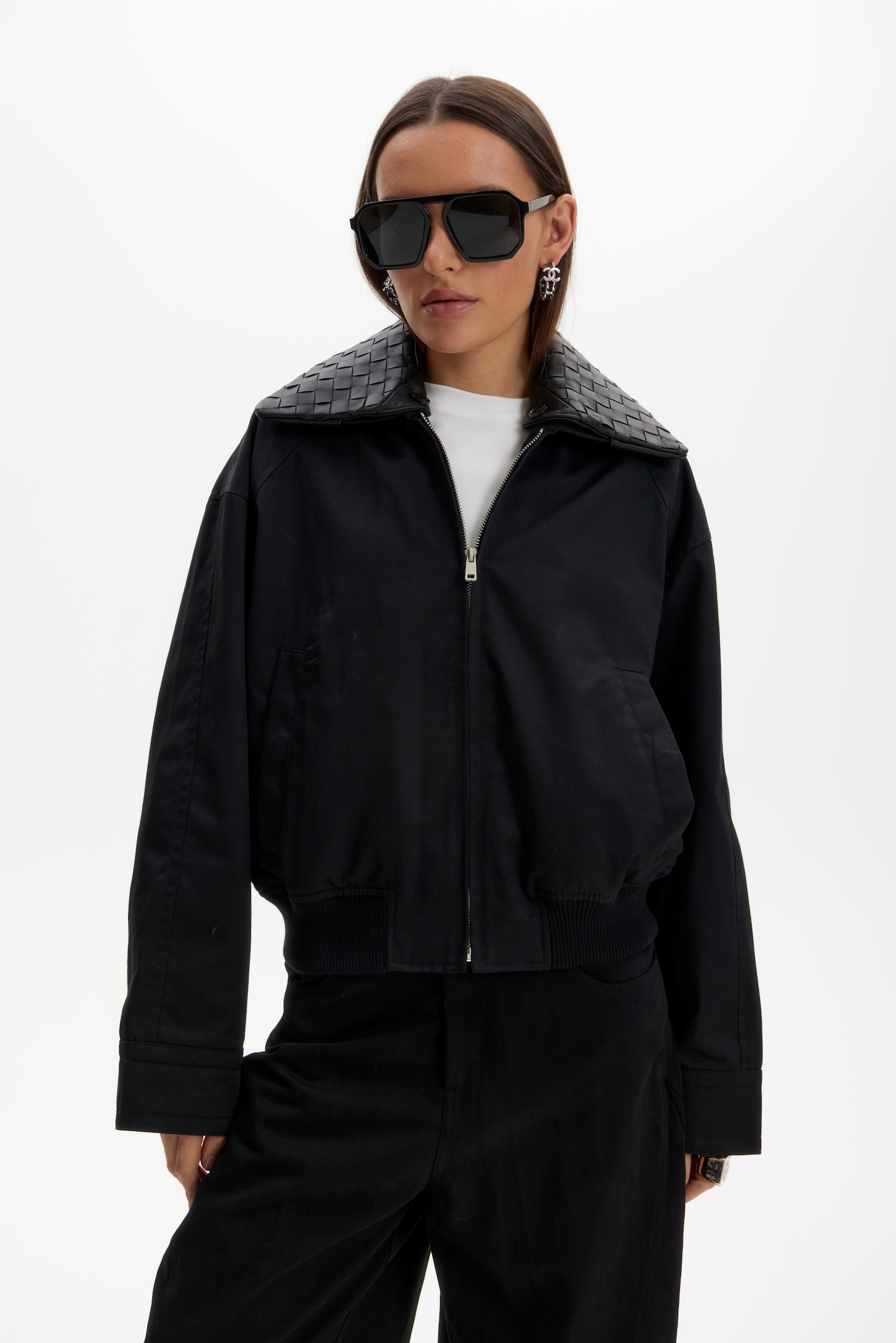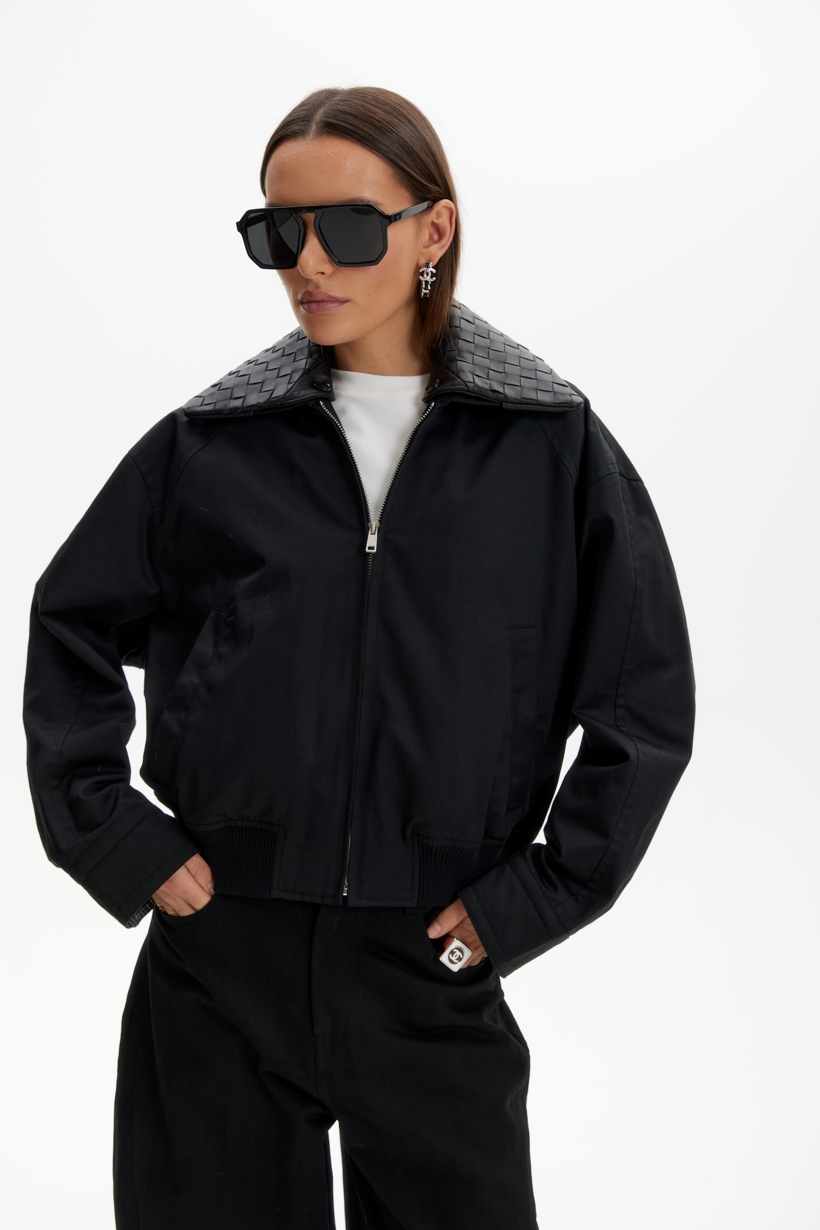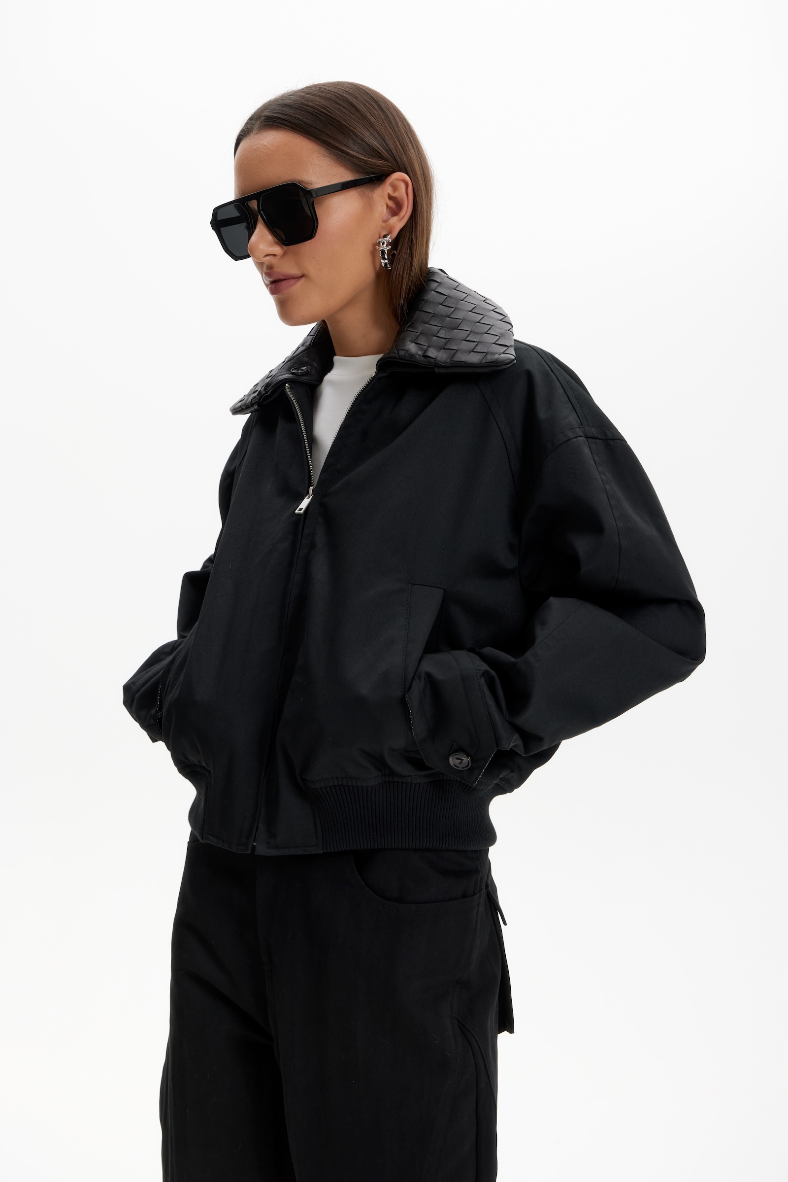 Бомбер с кожаным воротником в черном цвете. Съемный воротник.