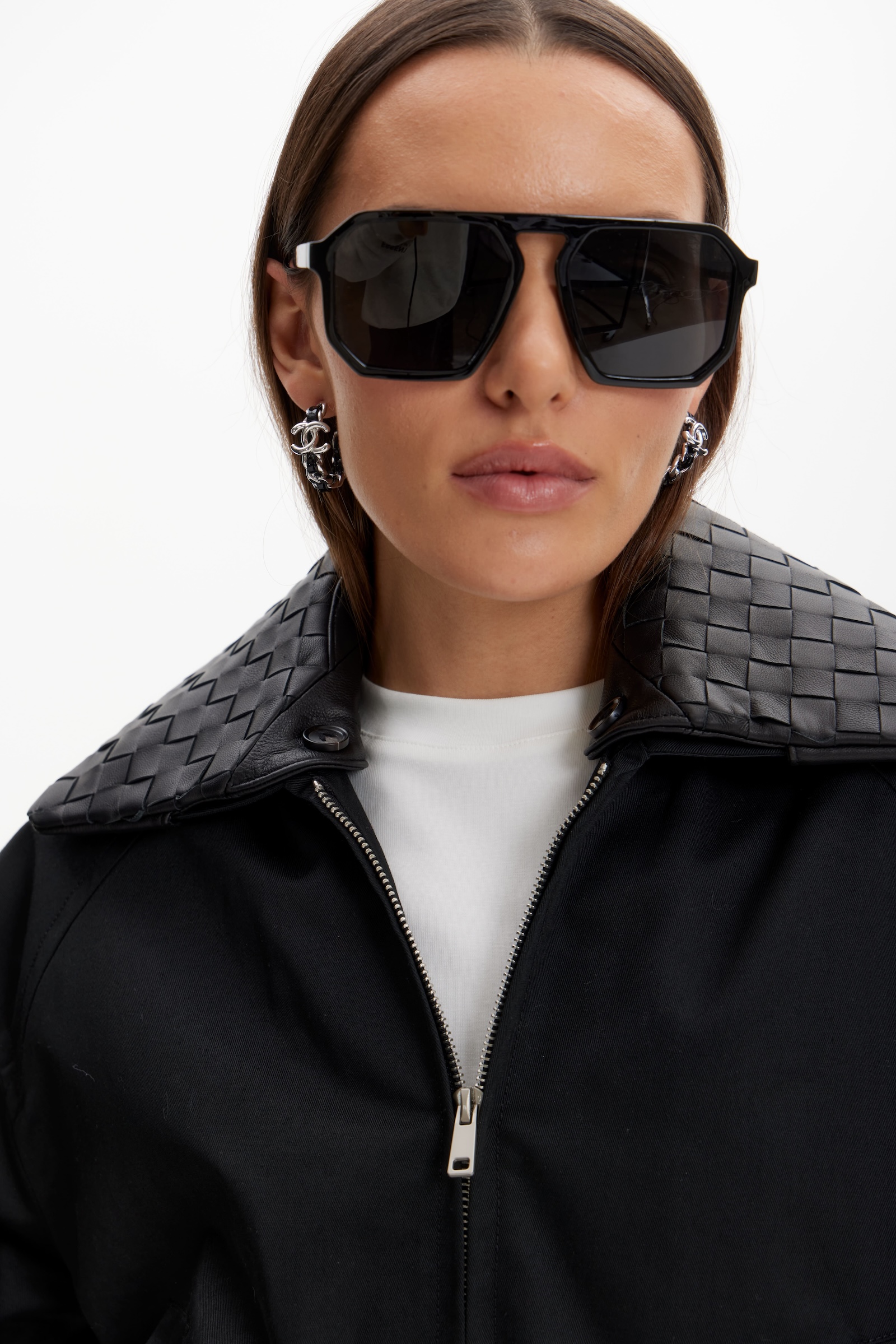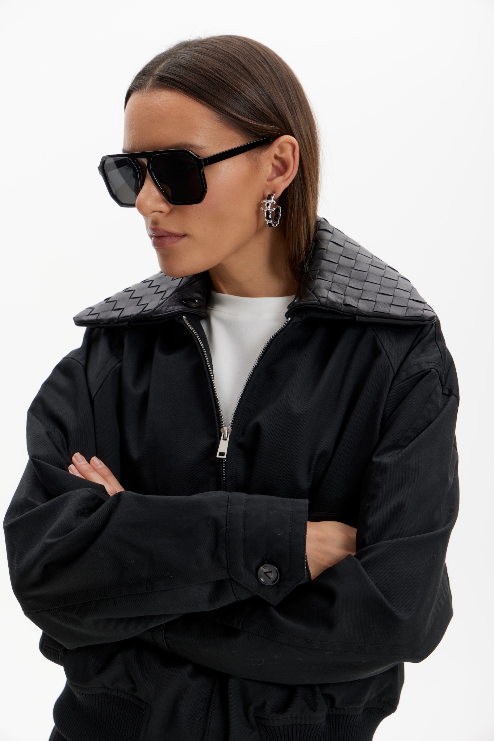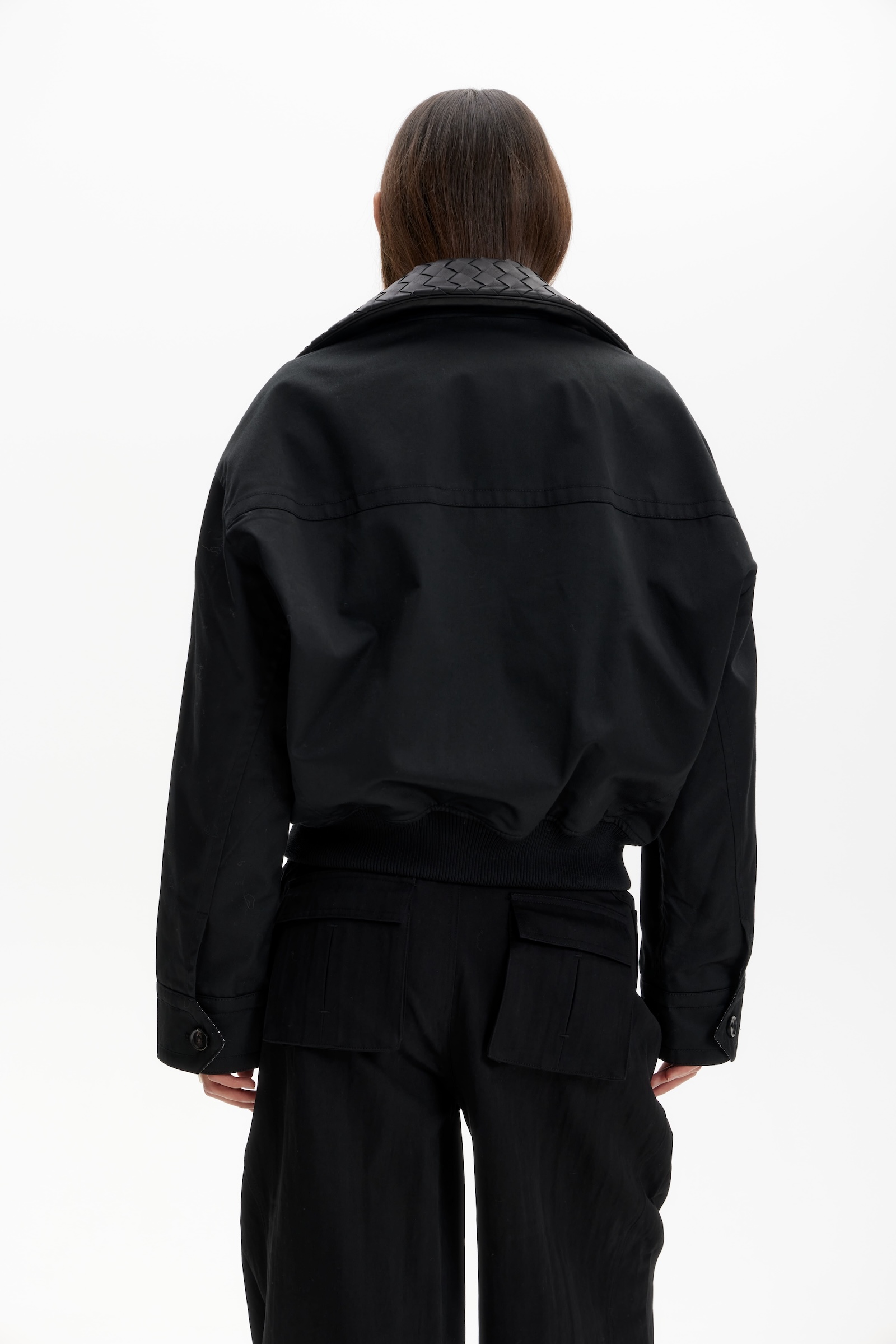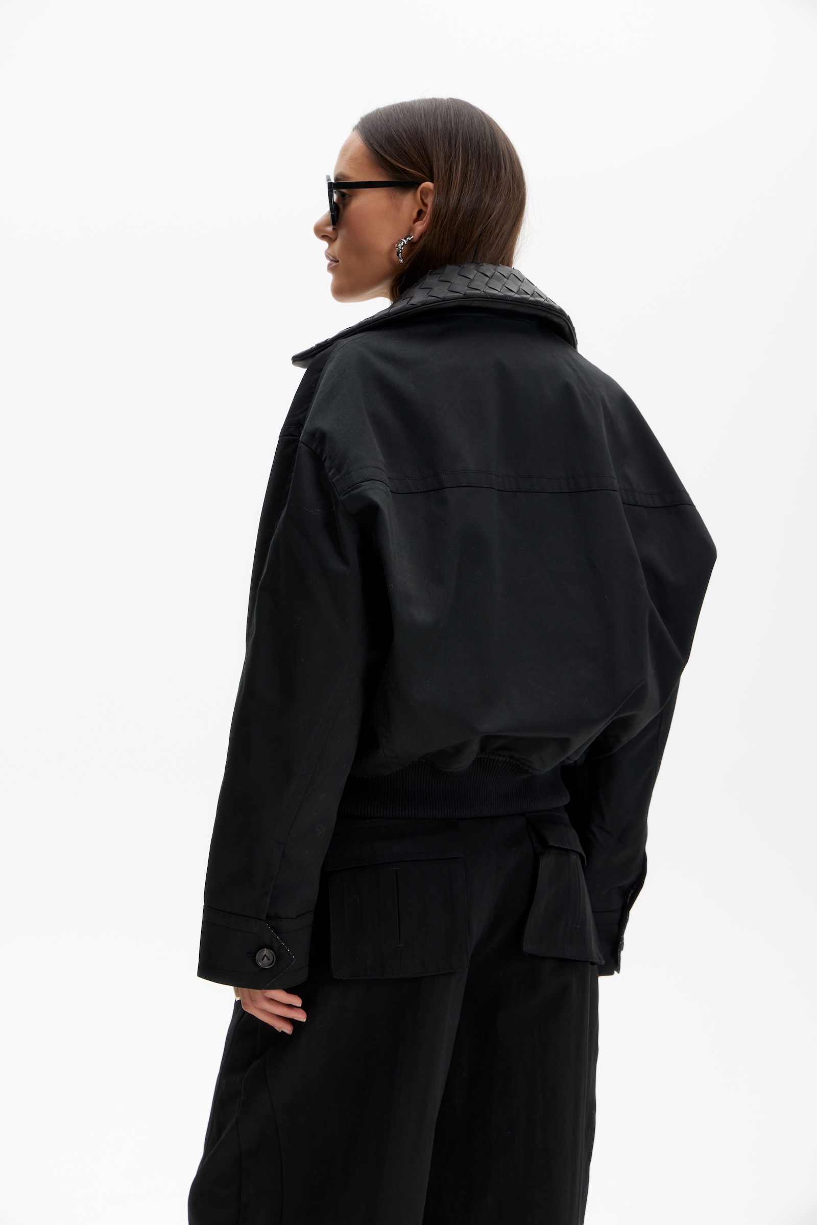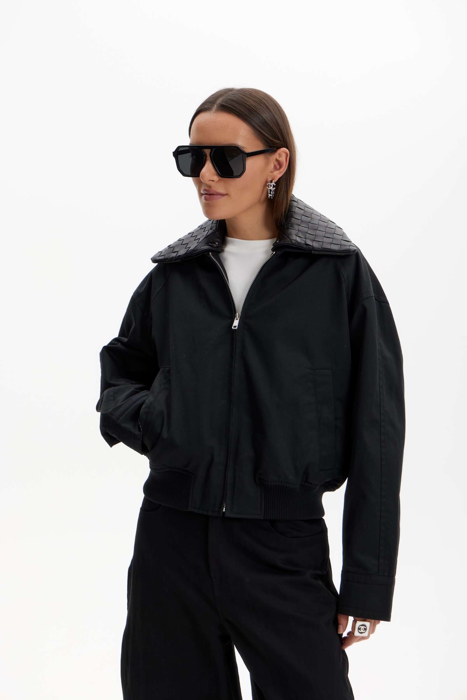 Бомбер с кожаным воротником в черном цвете. Съемный воротник.