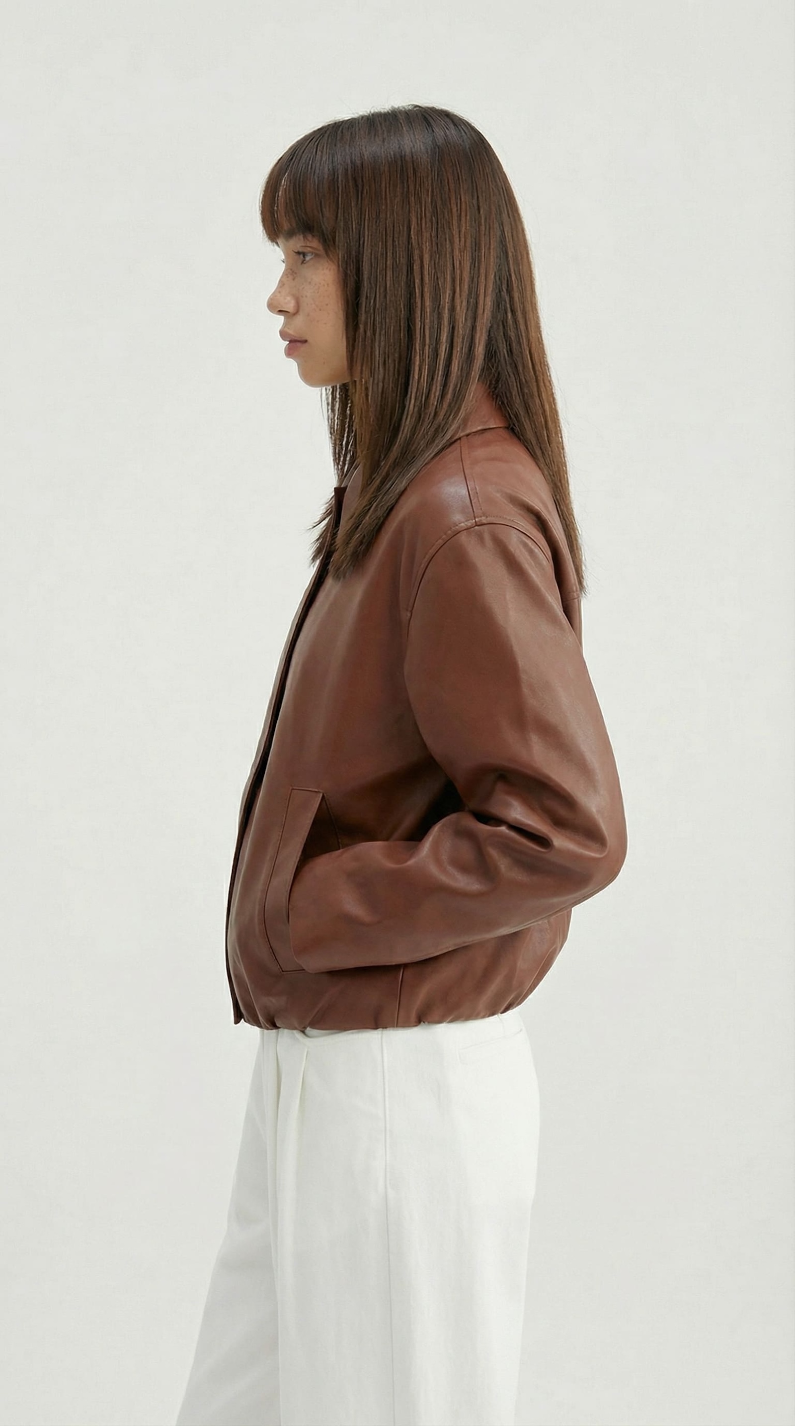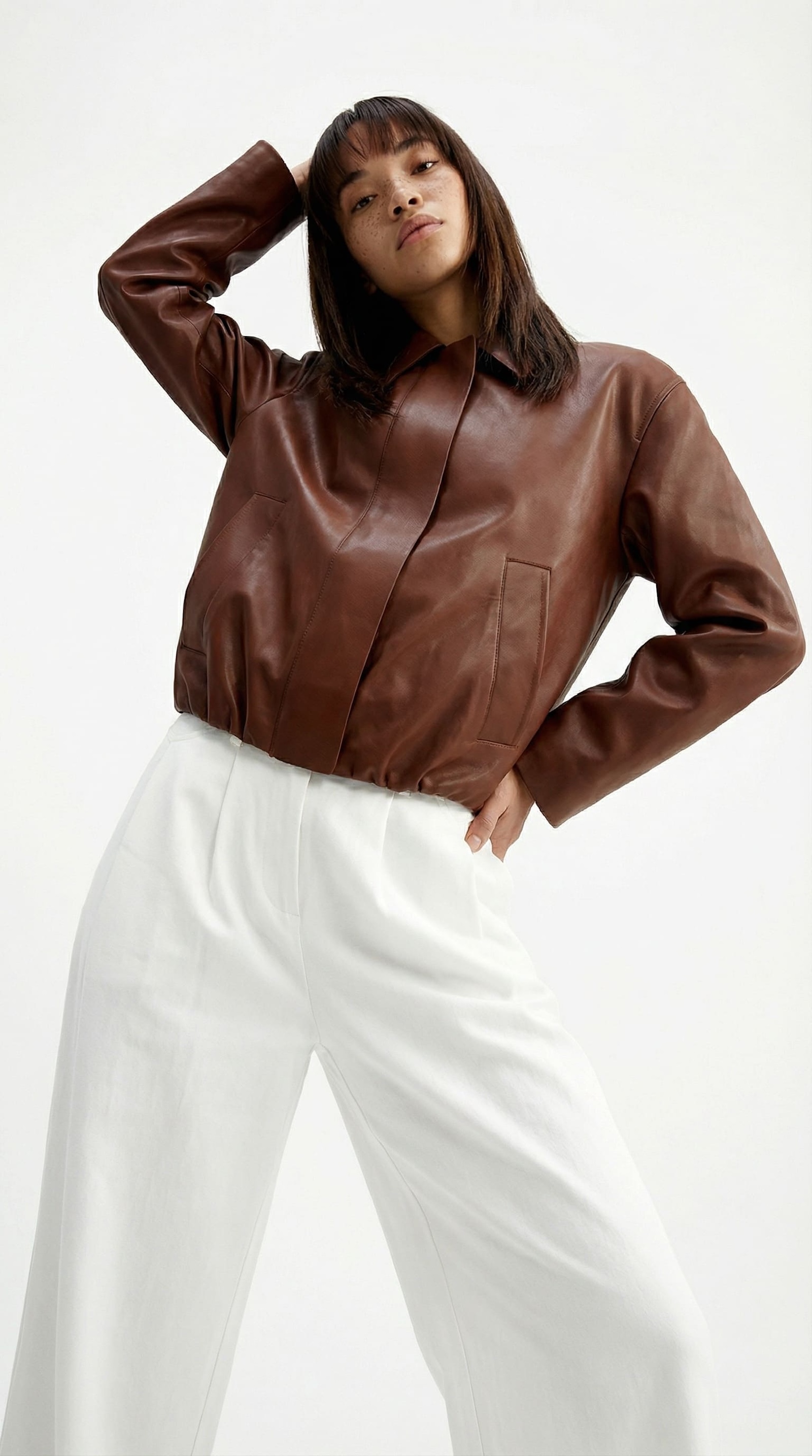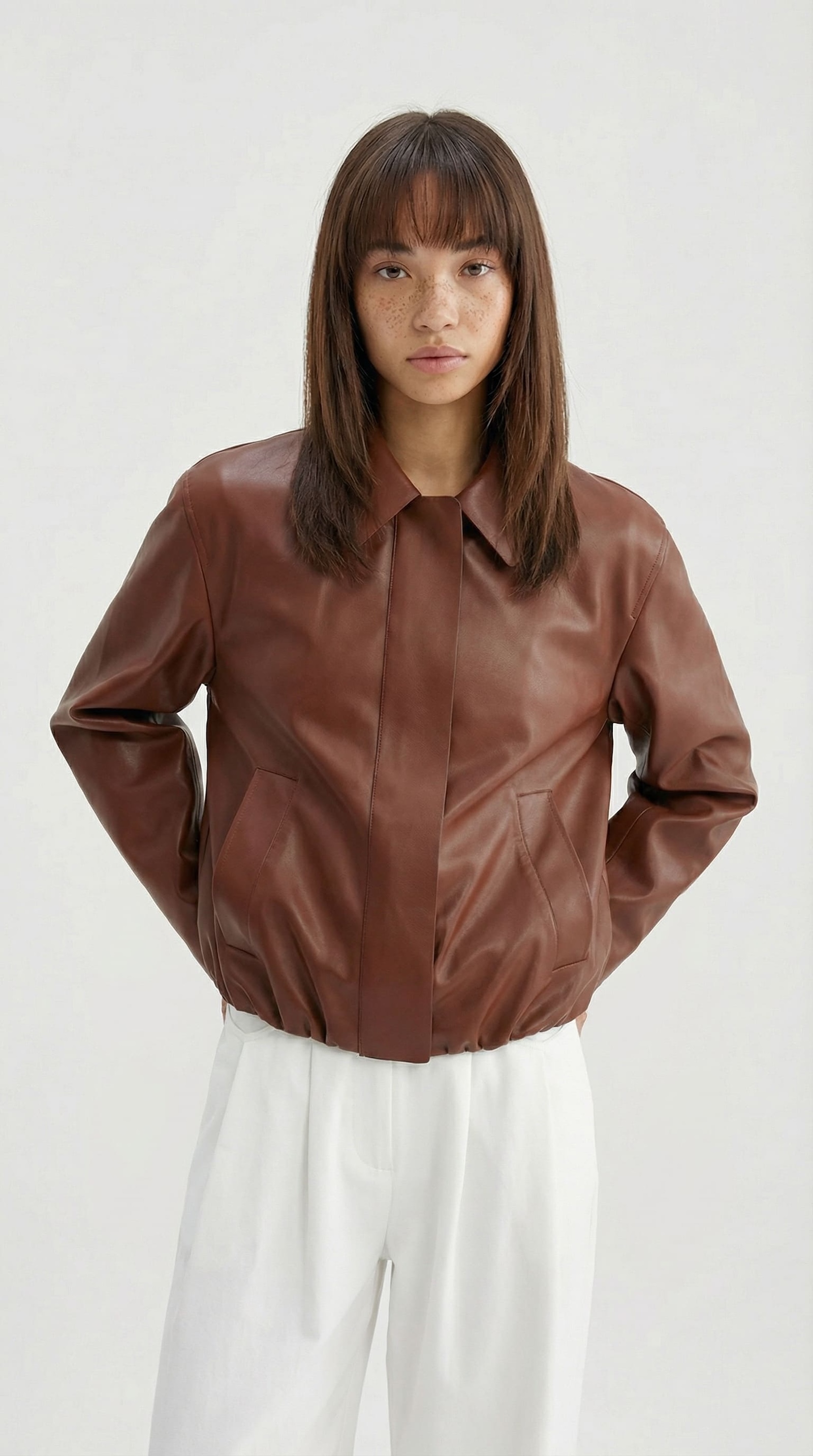 Бомбер из гладкой экокожи в коричневом цвете.