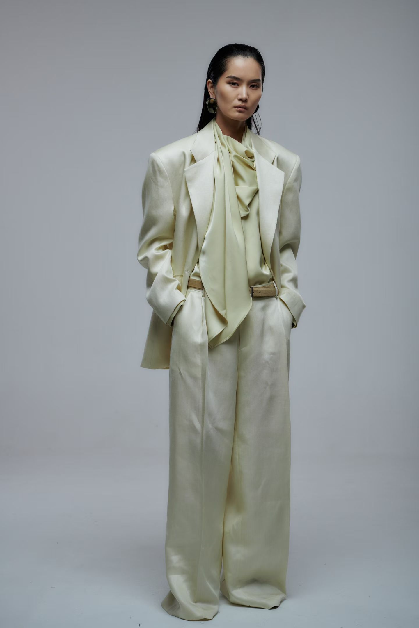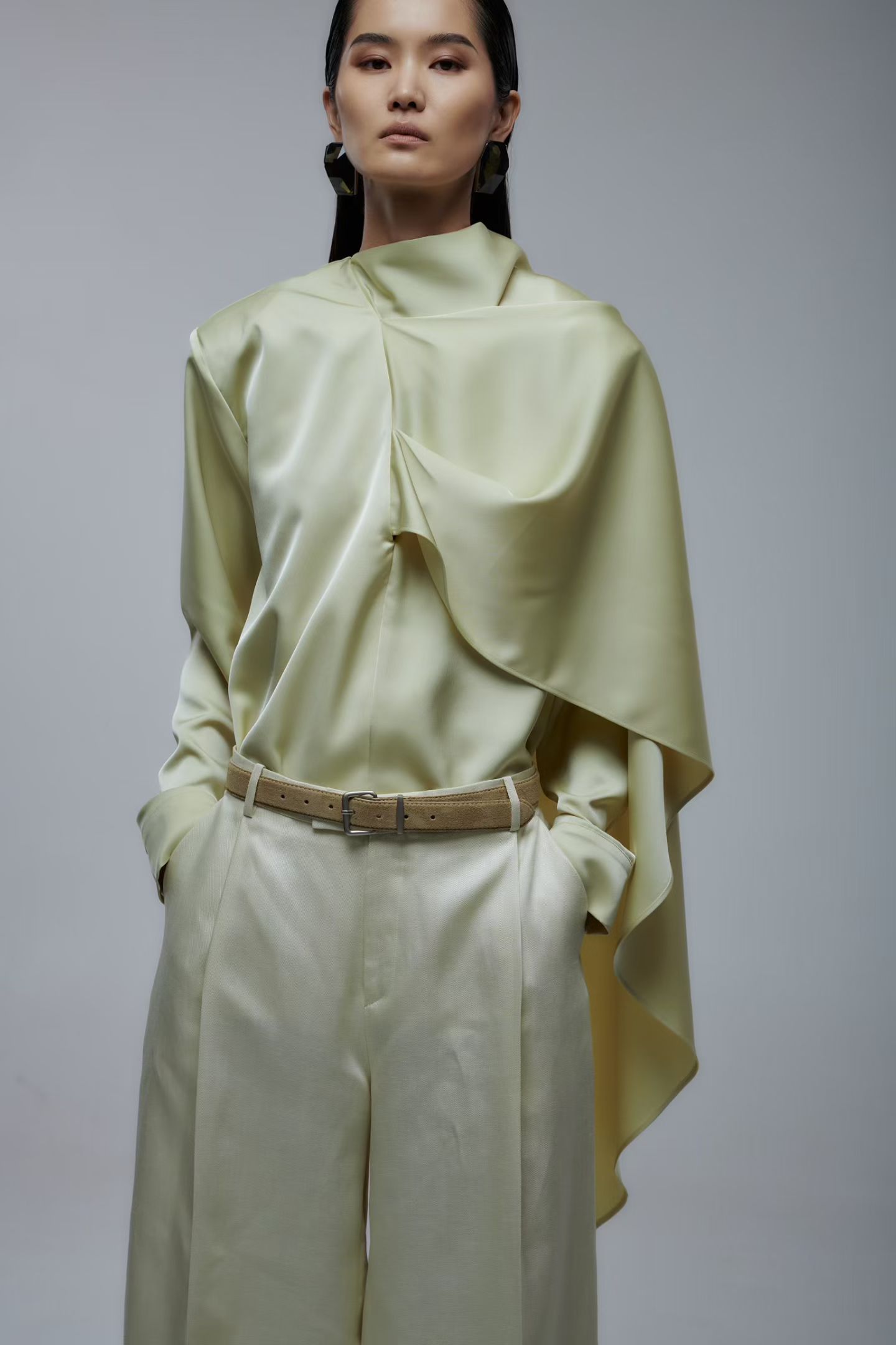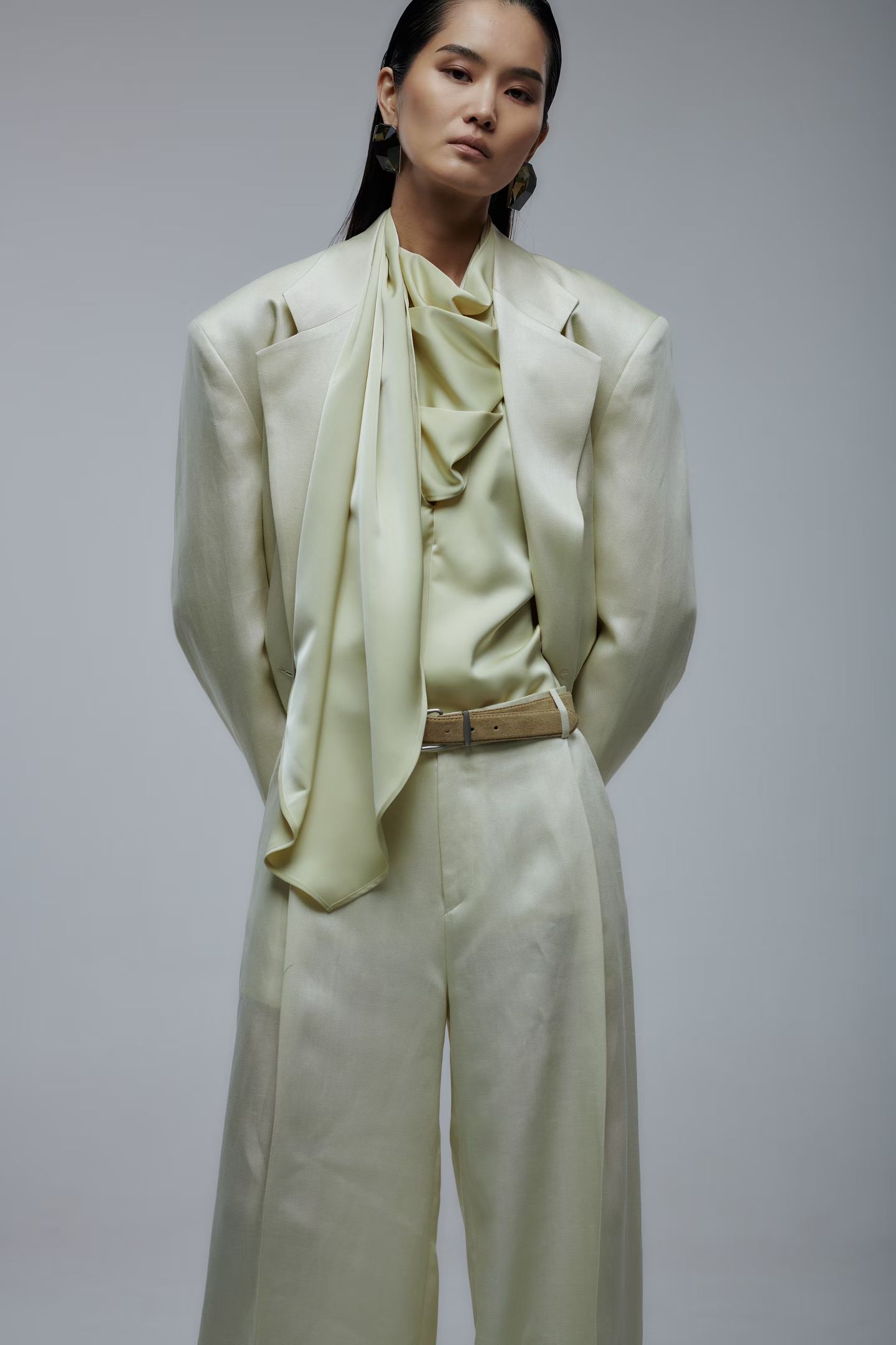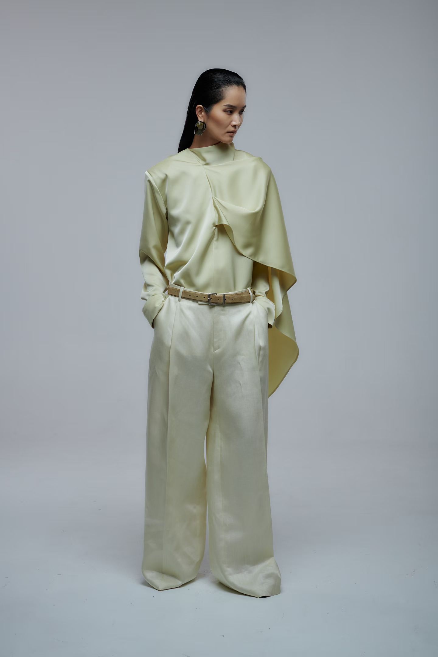 Брюки широкого кроя в желтом цвете.