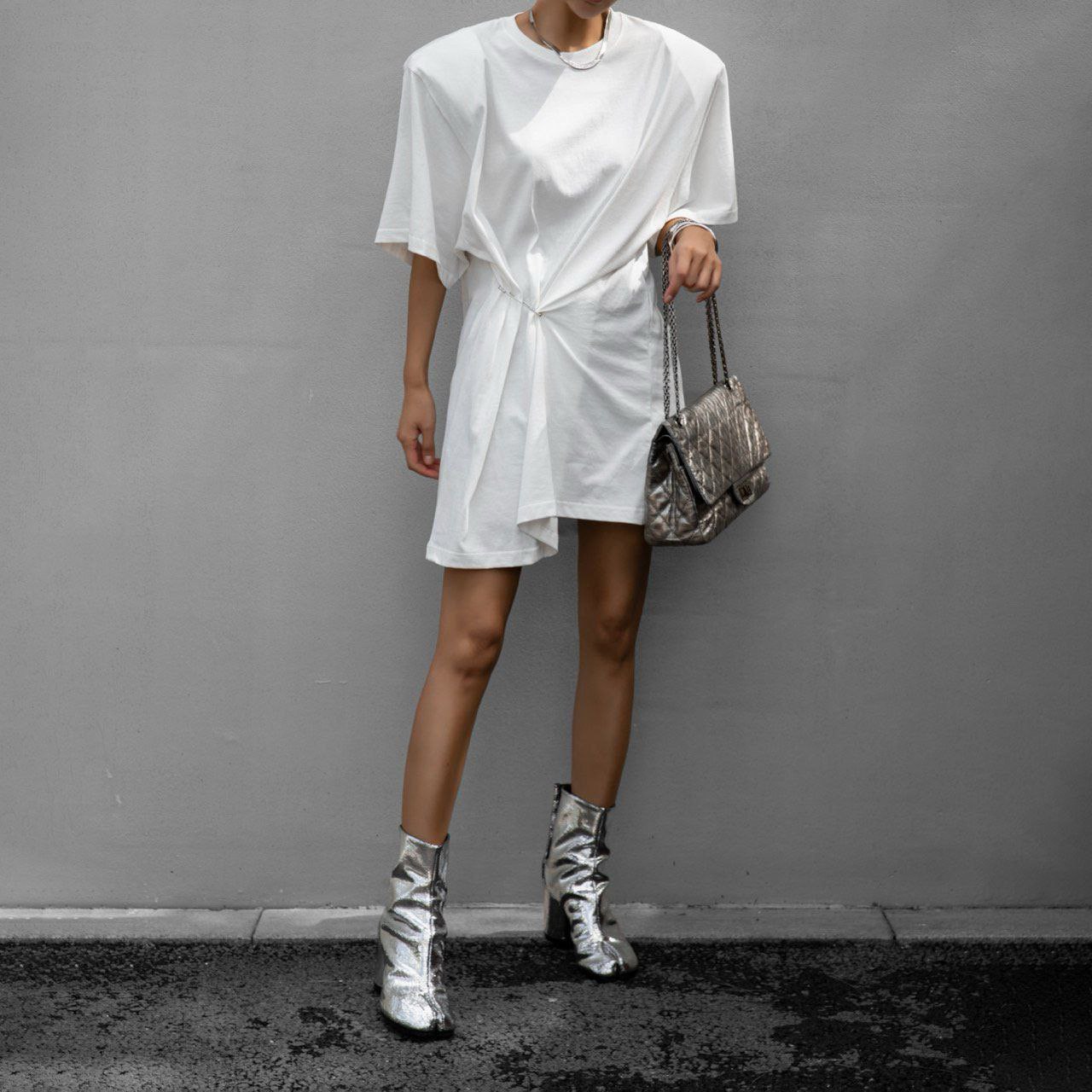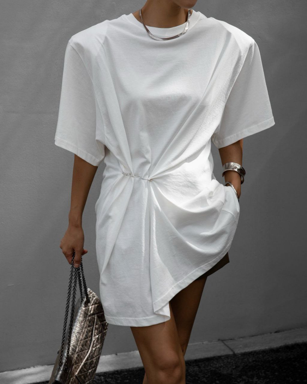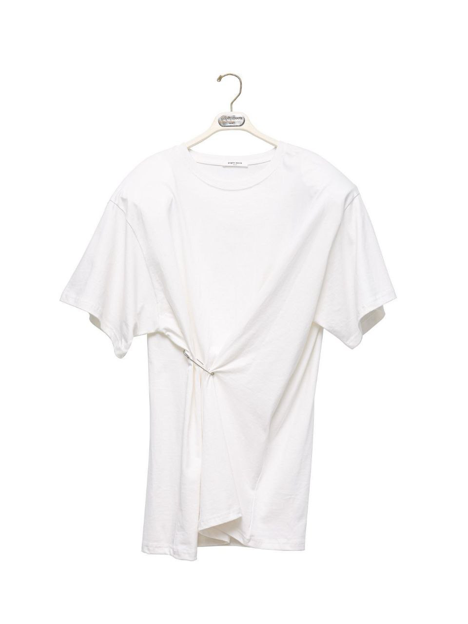 Футболка с булавкой в белом цвете. С помощью булавки возможно регулировать ширину изделия.