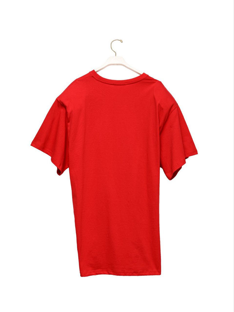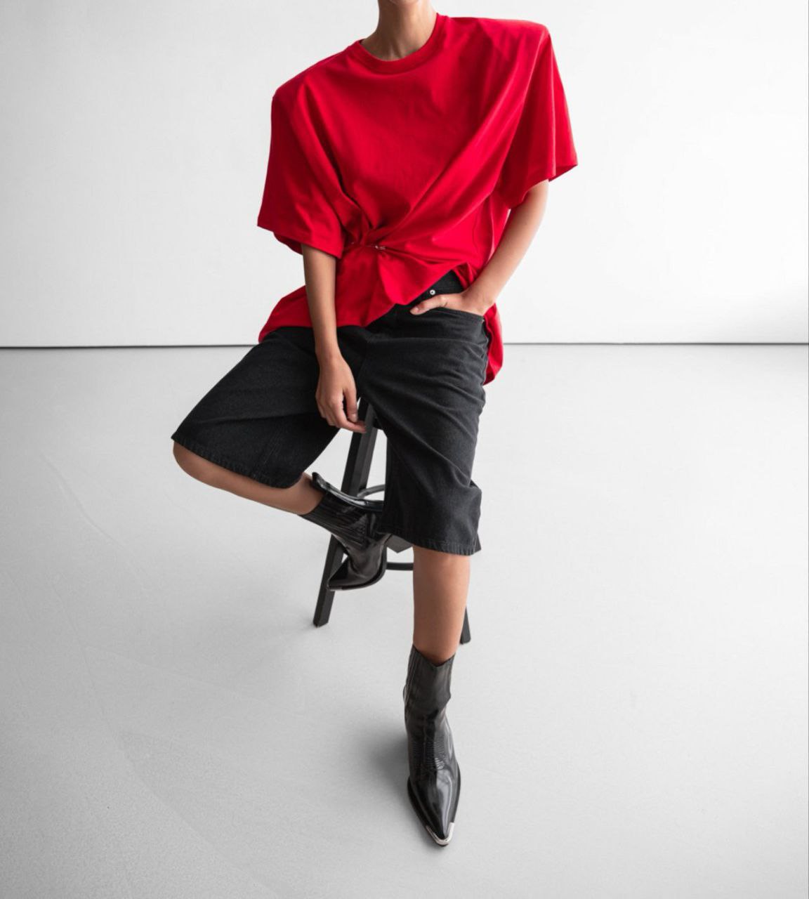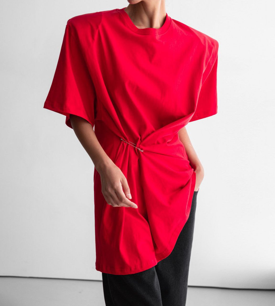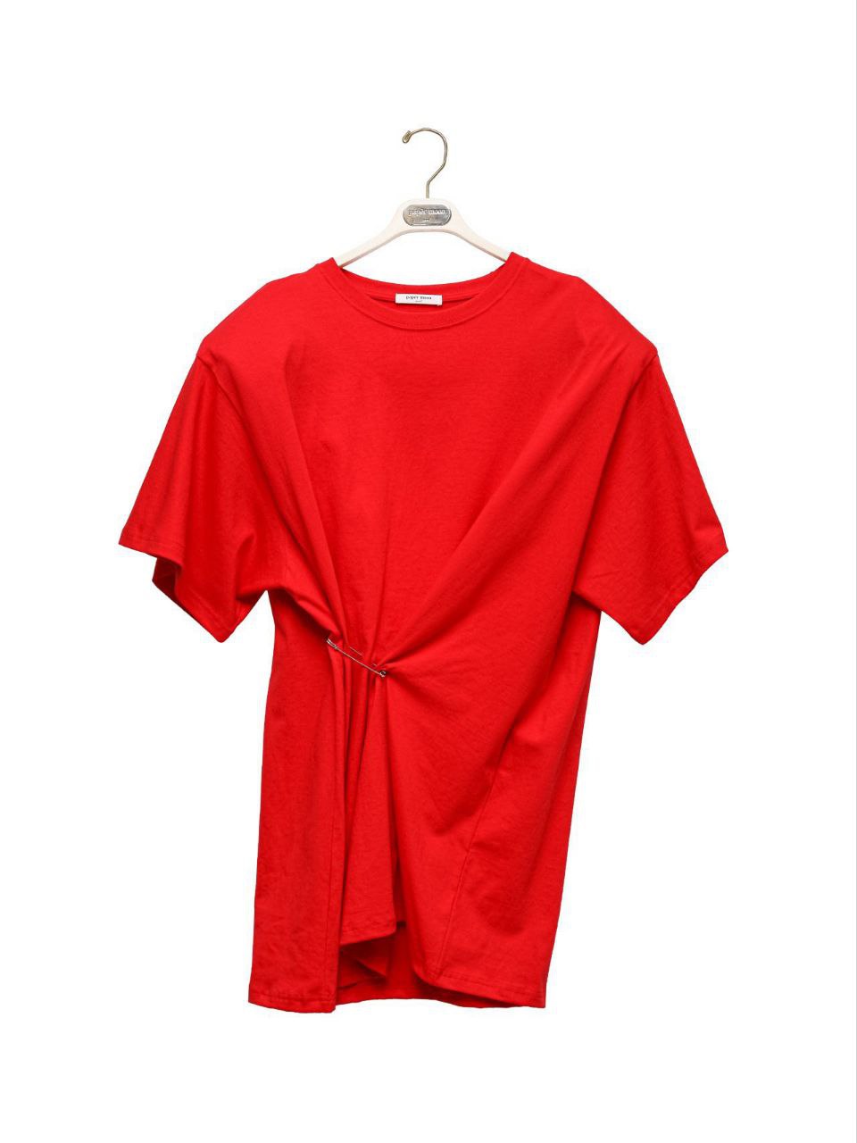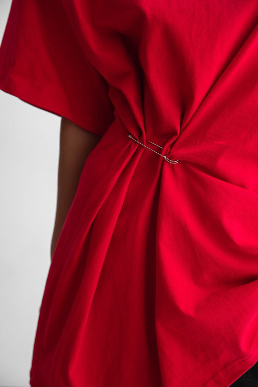 Футболка с булавкой в красном цвете. С помощью булавки возможно регулировать ширину изделия.