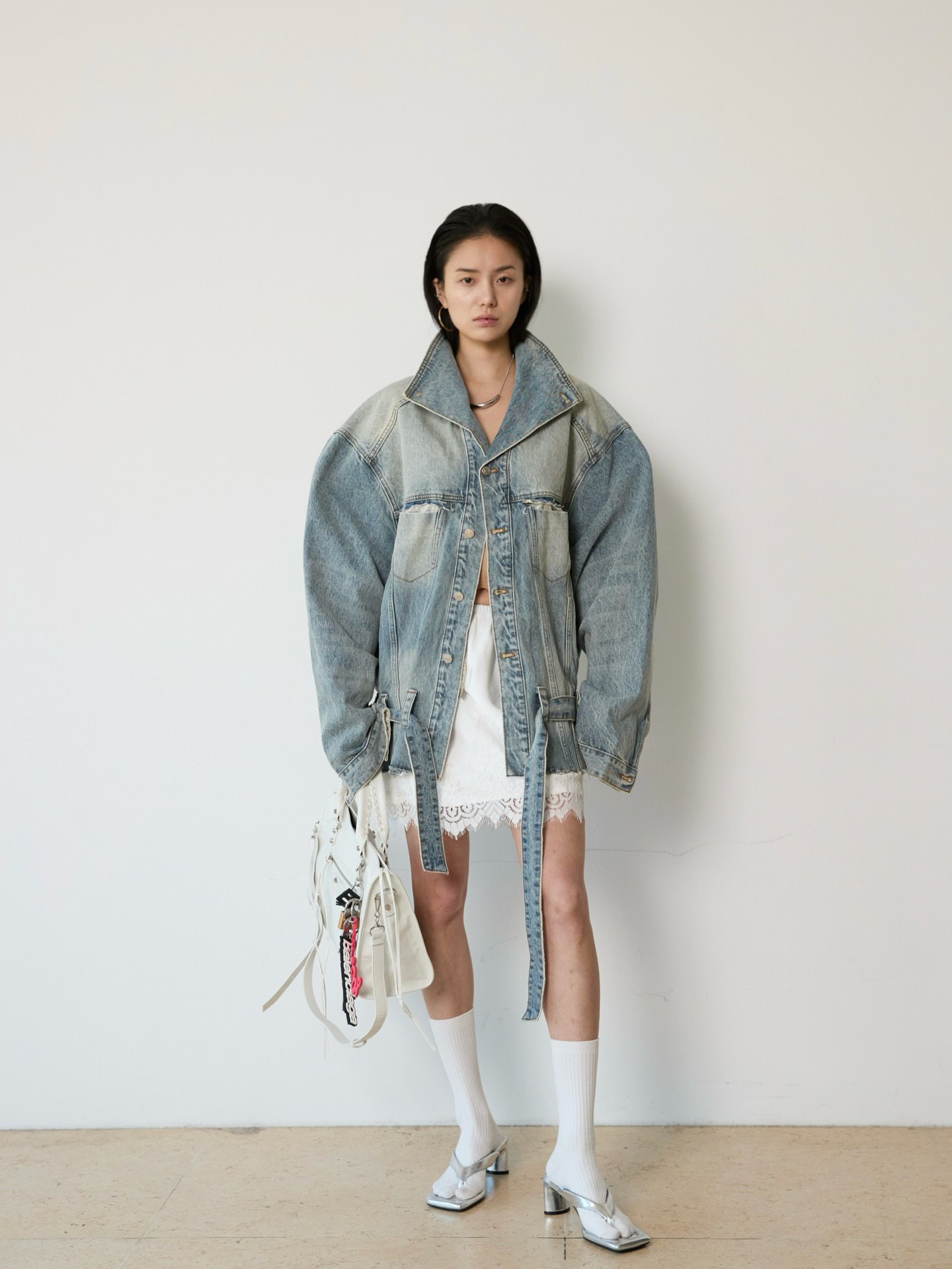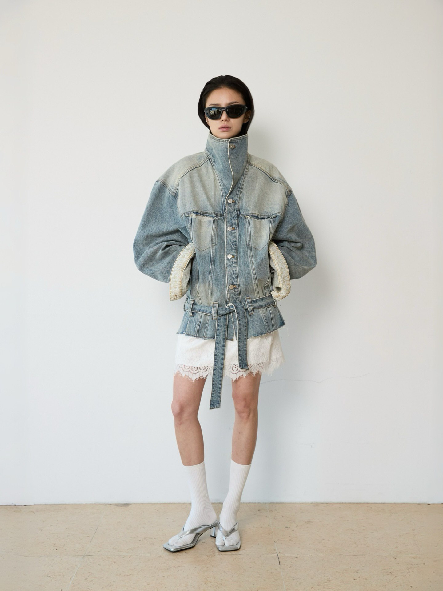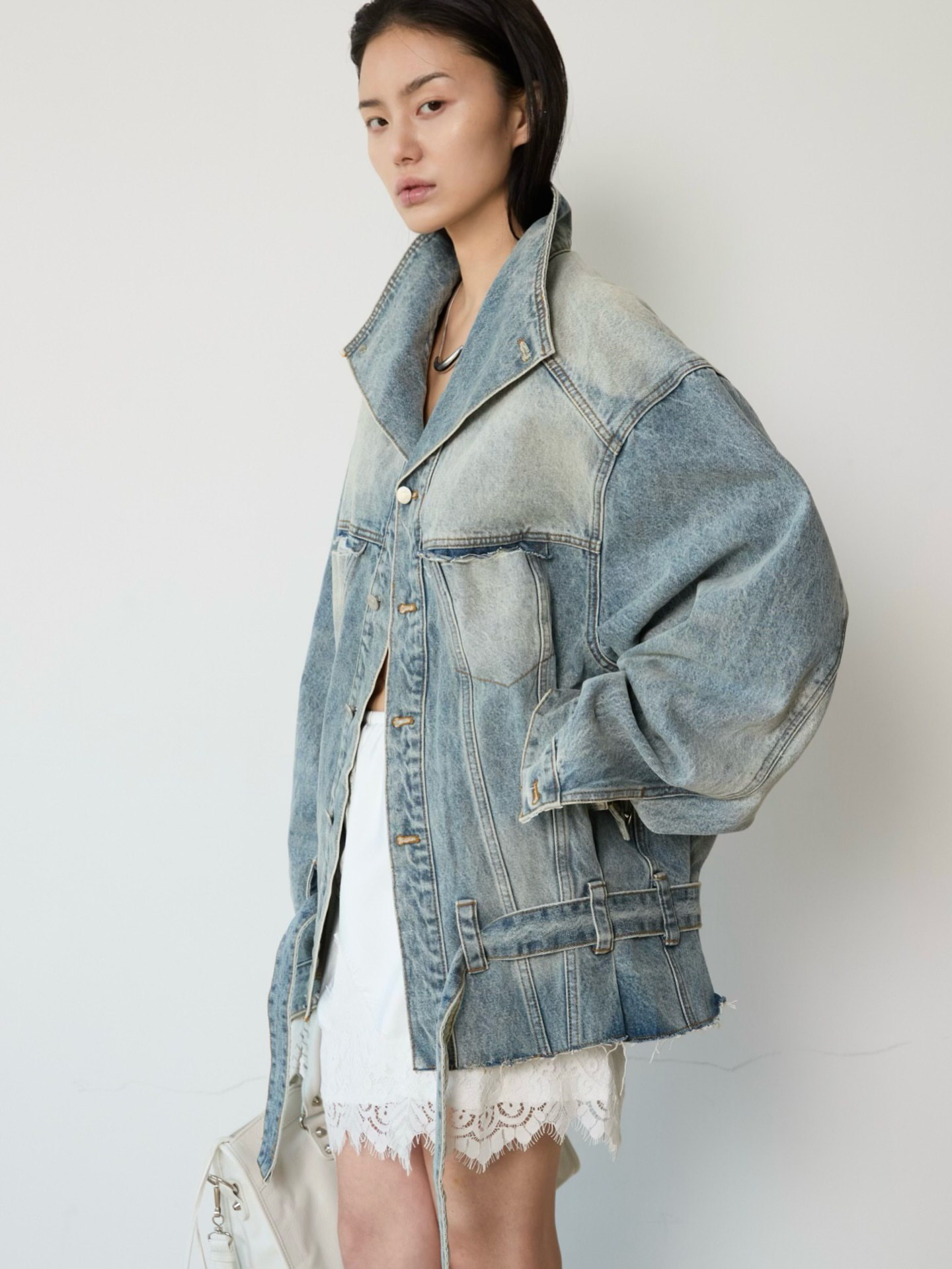 Джинсовая куртка с ремнем в голубом цвете.